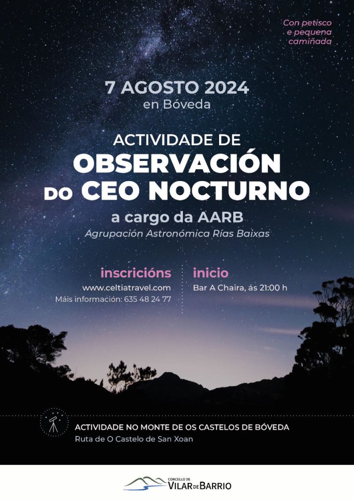 O concello de Vilar de Barrio promociona esta actividade de observación do ceo nocturno, que se desenvolverá pola Agrupación Astronómica RÃas Baixas. A actividade consistirá nun pequeno petisco e camiñada duns 2,5 km ata o lugar de observación. Despois do fin da actividade de observación do ceo nocturno, prevista ás 24:00 h (aproximadamente), volveremos a Bóveda tamén camiñando.